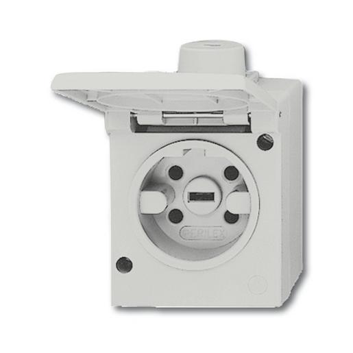 Steckdose, grau RAL 7035, Alu-Druckguss/Sondergeräte, Busch-Perilex nach DIN 49445-48, 3 P + N + E, 16/25 A, 415 V, Steckdose Mit Thermoplast-Klappdeckel. Viereckig. PVC-Einführung Nennstrom: 16 A Schutzart Gerät: IP 44