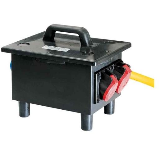 GIFAS-Vollgummi-Sicherheitsverteiler Typ 6700Eingang: 1 CEE-Einbaugerätestecker 5 x 63 A/400 VAusgang: 1 CEE-Einbausteckdose 5 x 63 A/400 V gerade Ausführung, ohne Absicherung1 CEE-Einbausteckdose 5 x 32 A/400 V abgesichert über 1 LS-Schalter 32 A, 3polig in C-Charakteristik´1 CEE-Einbausteckdose 5 x 16 A/400 V abgesichert über 1 LS-Schalter 16 A, 3polig in C-Charakteristik3 Schutzkontaktsteckdosen 230 V abgesichert über 3 LS-Schalter 16 A, 1polig in B-Charakteristik1 FI-Schalter 63/0,03 A, 4polig für alle SteckdosenAusführung: – Schutzorgane innenliegend unter dem Deckel (über 3 Rändelschrauben zu öffnen)Abmessungen: H x B x T = 305 x 350 x 280 mmSchutzart: IP 54Gl-Faktor: 0,5Gewicht: ca. 14 kgEigenschaften:- Gehäuse aus schlagfestem Vollgummi mit hoher mechanischer Festigkeit- beständig gegen Säuren und Basen- sehr gute Wetter-, UV- und Ozonbeständigkeit- hohes elektrisches Isolationsvermögen- Steckdosen und andre Komponenten einzeln auswechselbar und VDE geprüft- Einhaltung aller gültigen elektrotechnischen Sicherheitsvorschriften der VDE