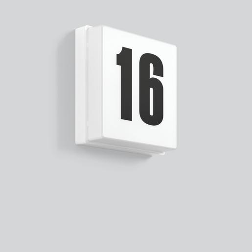 Quadratische Hausnummernleuchte. Armatur Kunststoff. Diffusor Kunststoff opal seidenmatt. Befestigung des Diffusors mit Federsystem. Beschriftung bitte separat bestellen!