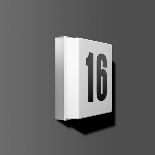 Quadratische Hausnummernleuchte. Armatur Kunststoff. Diffusor Kunststoff opal seidenmatt. Befestigung des Diffusors mit Federsystem. Beschriftung bitte separat bestellen!