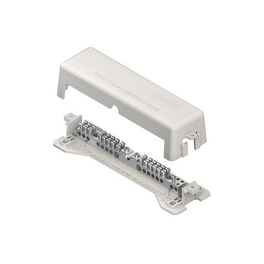 Potentialausgleichsschiene, mit plombierbarer Abdeckung, mit Kennzeichnung der Anschlüsse, für spezielle Anwendungen wie z.B in medizinisch genutzten Räumen, halogenfrei. Abmessung (ca. Maße) H x B x L : 42 x 51,5 x 172 mm Anschlussmöglichkeiten : 14 x 1,5 – 6 mm² 2 x 6 – 16 mm² 1 x 16 – 35 mm² Werkstoff Gehäuse : PP (Polypropylen) Werkstoff Klemmschiene : Messing, vernickelt Werkstoff Schrauben : Stahl, verzinkt Farbton : lichtgrau RAL : 7035 (ähnlich)