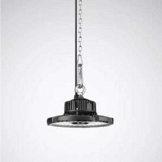 Runder LED-Hallenstrahler für abgehängte Montage. Für abgehängte Montage als Einzelleuchte. Ein-Punkt-Aufhängung an mittig angeordnetem Schraubhaken. Montagezubehör als separat zu bestellendes Zubehör verfügbar. Optisches System mit PC-Linsentechnik. Mit einer Optikeinheit pro LED-Modul.. Mit rotationssymmetrisch tief strahlender Lichtstärkeverteilung. Bemessungslichtstrom 30000 lm, Bemessungsleistung 230,00 W, Leuchten-Lichtausbeute 130 lm/W. Lichtfarbe neutralweiß, ähnlichste Farbtemperatur (CCT) 4000 K, allgemeiner Farbwiedergabeindex (CRI) Ra > 80. Mittlere Bemessungslebensdauer L65(tq 25 °C) = 50.000 h. Die Lichtquelle ist entsprechend der Ökodesign-Anforderungen (VO (EU) 2019/2020) austauschbar. Leuchtenkörper aus Aluminiumdruckguss. Oberfläche schwarz beschichtet (RAL 9005). Leuchtenhöhe 190 mm, Leuchtendurchmesser 320 mm. Zulässige Umgebungstemperatur (ta): -20 °C – +40 °C. Schutzklasse (EN 61140): I, Schutzart (DIN EN 60529): IP65, Stoßfestigkeitsgrad nach IEC 62262: IK08, Prüftemperatur Glühdrahttest gemäß IEC 60695-2-11: 650 °C. Gewicht: 2,7 kg. Das Produkt erfüllt die grundlegenden Anforderungen der anwendbaren EU-Richtlinien und des Produktsicherheitsgesetzes und trägt die CE-Kennzeichnung. Zusätzlich ist die Leuchte durch eine unabhängige Prüfstelle ENEC-zertifiziert.
