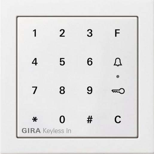 Gira Keyless In Codetastatur Reinweiß glänzend Merkmale: Montage in eine Gerätedose. Stand-alone-Gerät oder in Kombination mit dem Gira Türkommunikations-System. Beim Stand-alone-Betrieb Nutzung der integrierten potenzialfreien Relaiskontakte für Schalthandlungen, z. B. für Türöffner mit eigener Spannungsversorgung (z. B. handelsüblicher Klingeltrafo). Inbetriebnahme durch Direkt-Konfiguration ohne PC oder Programmiersoftware. Ein- und Ausgänge: Schaltkontakt: Zwei Relais mit potenzialfreien Wechselkontakten Belastbarkeit AC DC 24 V 1,6 A. Zwei Anschlüsse für Spannungsversorgung. Codetastatur als Zutrittskontrollsystem mit kapazitiv wirkenden und damit verschleißfreiem Tastenfeld. Keine erkennbare Abnutzung häufig benutzter Ziffernkombination. Stand-alone-Gerät oder in Kombination mit dem Gira Türkommunikations-System als Türrufsystem für Gebäude mit mehreren Wohneinheiten. Sondertaste „C“: Löschen einer Falscheingabe. Sondertaste „Schlüssel“: Nach richtiger Code-Eingabe direkte Türöffnung. Sondertaste „Glocke“: Gezielte Anwahl von Wohnungsstationen in großen Objekten. Sondertaste „F“: Schaltfunktionen mit Schaltaktoren des Gira Türkommunikations-Systems. Homogene blaue LED-Beleuchtung der Ziffern und Sonderzeichen bei Nacht. Master PIN-Nummer auf beiliegender versiegelter Sicherheitskarte bei Verlust der Administrator-PIN-Nummer. Die Codetastatur kann bis zu 255 Codes verwalten. Bis zu 32-stellige Codes möglich. Akustische Rückmeldung bei Tastenbetätigung. 3-farbige LED-Statusanzeige bei der Programmierung und während der Bedienung. Warnton bei unberechtigter Entnahme des Tastaturaufsatzes zur Sabotageerkennung. Sabotageschaltung mit Schaltaktor im Gira Türkommunikations-System. Den beiden integrierten Wechslerrelais können zwei unterschiedliche Codes zugeordnet werden, z. B. Code 1: Türöffnung, Code 2: Schalten des Außenlichts. Ein- und Ausgänge: Steckerleiste Verbindungskabel für Gira Türkommunikations-System. Hinweise : Mit dem TKS-IP-Gateway können die Keyless In-Geräte an den Gira HomeServer angebunden werden. Dadurch sind intelligente Verknüpfungen möglich. So können z. B. temporäre oder einmalige Zugangsberechtigungen ganz einfach erteilt werden. Alle Daten inkl. der Zugangsberechtigungen lassen sich dann zentral und flexibel über den Gira HomeServer verwalten. Integration in das Profil 55 möglich. Der Gira AppShop ist der Marktplatz für interessante Lösungen und Anwendungen der intelligenten Gebäudetechnik. Inzwischen sind dort mehr als 200 Apps erhältlich, darunter Anwendungsbeschreibungen, Plug-ins, Funktionsvorlagen, Logikbausteine und Musterprojekte. Entdecken Sie jetzt Anwendungen für die Gira Keyless In Codetastatur. www.appshop.gira.de.