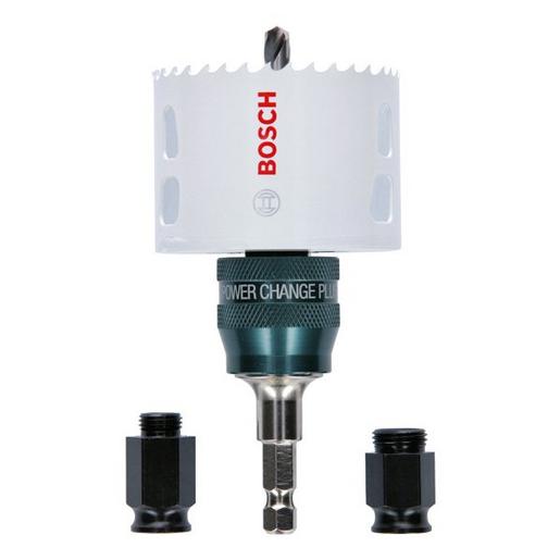 Das Starter-Set ermöglicht die Aufrüstung jeder Standard-Lochsäge auf das Power Change Plus System. Das Set enthält zwei Adaptermuttern als schlüssellose Verbindung zwischen Elektrowerkzeugen und Lochsägen. Darüber hinaus enthält es einen schlüssellosen Power Change Plus-Adapter und einen Zentrierbohrer.