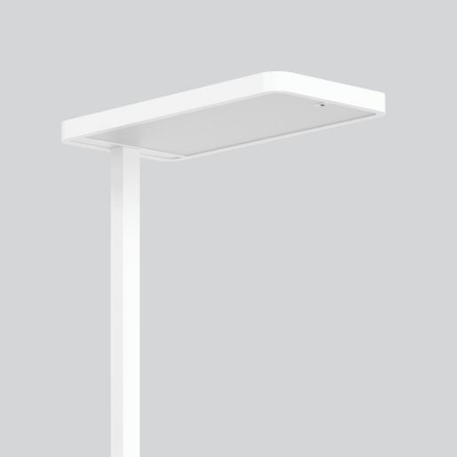 LED-Stehleuchte für Einzel- und Doppelarbeitsplatz mit intelligenter Anwesenheitssteuerung und Helligkeitssensorik. Flache Fußplatte aus Stahl für hohe Standsicherheit und platzsparende Positionierung an Büromöbeln. Kopf und Säule aus Aluminium. Leuchte pulverbeschichtet. Wipptaster zum Schalten, Dimmen und Speichern von Helligkeitswerten. Leuchtenkopf (L 675 x B 350 x H 40 mm). Fußplatte (450 x 340 mm) mit breiter Öffnung (150 mm). Diffusoren aus vergilbungsfreiem Kunststoff (PMMA). Lichtaustritt direkt 20%, indirekt 80%. Lichtlenkung direkt über Diffusor Kunststoff mikroprismatisch. Lichtlenkung indirekt über Diffusor Kunststoff klar. Leuchte gemeinsam schaltbar. Dimmbereich 1% bis 100%. Betriebsgerät im Standrohr integriert. Mit Anschlussleitung 2 m inklusive Schutzkontaktstecker (Schuko). Leuchte geht nach Netzwiederkehr in Stand-by. Hervorragend geeignet für Bürobereiche (UGR < 19) und Bildschirmarbeitsplätze (BAP) gem. DIN EN 12464-1.