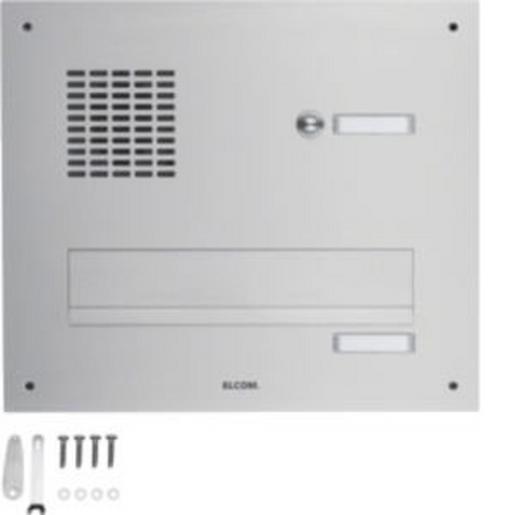 EMT-1/1 Mauerdurchwurf-Briefkastenfront für Türlautsprecher 1/1 Edelstahl ESTA. Mauerdurchwurf-Briefkastenfront für Hausbriefkästen nach DIN EN 13724 mit Audio-Türstation für Sprechanlage/Intercom nach DIN EN 50486, aus Edelstahl matt gebürstet, Dicke 2 mm. Bestehend aus Frontplatte mit Einwurfklappe(n), Spezialschrauben und Namensschild(er) (von vorn wechselbar) mit LED-Beleuchtung. UP-Außentürstation mit Lochsprechgitter, runder Klingeltaster und Türlautsprecherhalterung mit Schnellmontage. Hinweis: Passende Elektronik, Lautsprecher und Mauerdurchwurfkasten erforderlich.