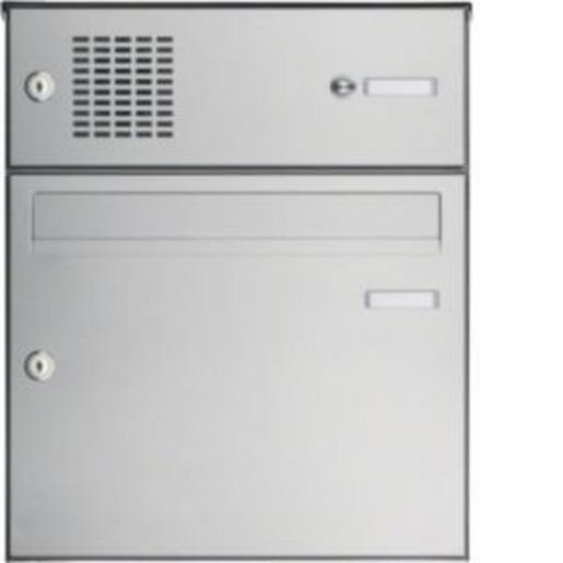 EAT-1/1 Briefkasten für Türlautsprecher 1/1 AP Edelstahl ESTA. Aufputz Briefkasten nach DIN EN 13724 für Audio-Türstation als Sprechanlage/Intercom nach DIN EN 50486 in 1+n-Technik, aus Edelstahl matt gebürstet, Dicke 2 mm. Bestehend aus einem viereckiger allseitig geschlossener Briefkasten mit Tropfkante als Regenschutz, Tür(en) mit BK-Sicherheitsschloss inkl. 2 Schlüsseln und Einwurfklappe(n), Lochsprechgitter, runder Klingeltaster, Namensschild(er) (von vorn wechselbar) mit LED-Beleuchtung und Türlautsprecherhalterung mit Schnellmontage. Hinweis: Passende Elektronik und Lautsprecher erforderlich.