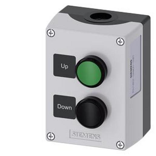 Gehäuse für Befehlsgeräte, 22 mm, rund, Gehäusematerial Kunststoff, Gehäuseoberteil grau, 2 Befehlsstellen Kunststoff, B=Drucktaster grün, Schild: Up, 1S, Schraubanschluss, A=Drucktaster schwarz, Schild: Down, 1S, Schraubanschluss, Bodenbefestigung, oben und unten je 1xM20, Schilder eingeklebt Gehäuse SIRIUS ACT für die Montage der 22,5 mm Befehls- und Meldegeräte bei räumlich getrennter Anordnung von Steuereinheiten und Schaltschränken.Unter dem Markennamen SIRIUS ACT bietet Siemens ein einzigartiges Portfolio an Befehls- und Meldegeräten mit weltweiten Produkt-Zulassungen in drei modernen Designreihen aus robustem Echtmetall und hochwertigem Kunststoff.Das innovative Aufschnappkonzept vereinfacht die Montage so weit, dass dafür nur eine Hand und kein Spezialwerkzeug erforderlich ist. Als Montagebohrungen genügen nutfreie Löcher, da bereits ein 100%iger Verdrehschutz integriert ist.Dank der durchgängig hohen Schutzart sind die robusten Geräte industrietauglich und für den Außeneinsatz geeignet. Sogar die Reinigung mit Hochdruckstrahl ist möglich. Weder Staub, Öle noch aggressive Laugen können den zuverlässigen Betrieb stören.Neben der Standardverdrahtung können die meisten Geräte auch über PROFINET, AS-Interface oder IO-Link an die Steuerung angebunden werden. Damit reduzieren Sie Ihren Verdrahtungsaufwand, minimieren Fehlerquellen und gewinnen mehr Flexibilität.Komfortabel unterstützt der grafische Online-Konfigurator bei Auswahl und Bestellung von Einzelgeräten, Gehäusen und Beschriftungen. Umfangreiche Dokumentation (z.B. Handbuch, 3D-Daten, Anschlussdiagramm) ist verfügbar.Lieferbare Ausführungen: gelb/grau, Kunststoff/Metall, 1-6 Befehlstellen, Leergehäuse/Vorbestückung, wahlweise mit AS-Interface-Anbindung.SIRIUS ACT – Performance in Action beim Befehlen und Melden. Einfach montiert, einfach stark, einfach perfekt.