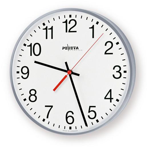Innenuhr, rund, einseitig, Metallgehäuse, silbergrau-metallic (RAL 9006 weißaluminium), gewölbtes blendarmes Mineralglas. Weißes Metallzifferblatt mit schwarzen arabischen Zahlen, Zifferblattdruck nach DIN 41091. Schwarze Balkenzeiger für Stunden- und Minutenanzeige, bzw. rot für Sekundenanzeige.