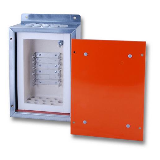 Abmessungen (B x H x T): 250 mm x 350 mm x 130 mm Kabeleinführung 2 x PG29, 24x PG16, Gewicht 7.9 kg Mit eingebauter LSA-Montagewanne 2/10 Gehäuse verzinktes Stahlblech, Schutzart IP43 Auskleidung mit Brandschutzplatten bzw. Intumeszenzmaterial im Bereich der Kabelführung Bauaufsichtliche Zulassung durch das DIBT-Berlin Z-78.7-97