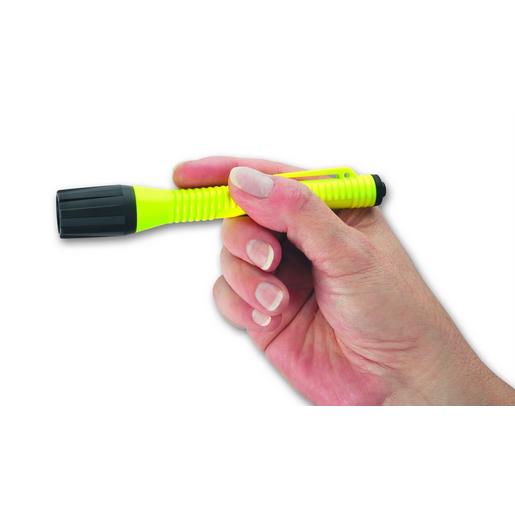 Sehr kompakte ex-geschützte Taschenlampe mit einer Power LED EX-Zonen: 1, 2, und 21, 22 Schutzart IP 68 tauchfähig bis 3 m Tiefe sehr helle und breite Ausleuchtung: die ideale Prüf- und Inspektionsleuchte – im Stiftleuchtenformat: passt in jede Hemd- oder Jackentasche extrem schlagfest und langlebig kompakte Maße 145×20 mm inkl. 2 AAA Batterien. Leuchtweite ca. 30 m Leuchtdauer ca. 4 Std. Gewicht 45 g