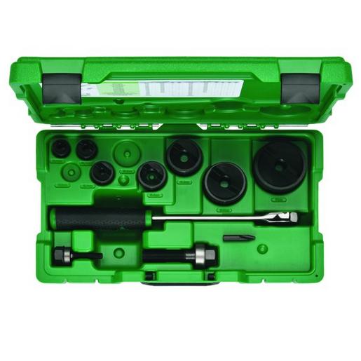Bestehend aus Zugschraube für manuelle Betätigung Durchmesser 9,5 x 40 mm (50000420), Zugschraube für manuelle Betätigung Durchmesser 19,0 x 55 mm (50040405), Ratsche (50349414), Slug Buster Spalt-Blechlocher-Satz PG 9/11/13/16/21/29/36/48 und 30,5 mm, Kunststoffkoffer (50366858).