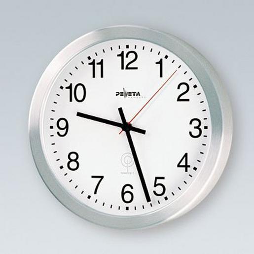 Innenuhr, rund, einseitig, Wandbefestigung, Aluminiumgehäuse matt-geschliffen, flaches Mineralglas. Batteriebetrieb 1,5 V.