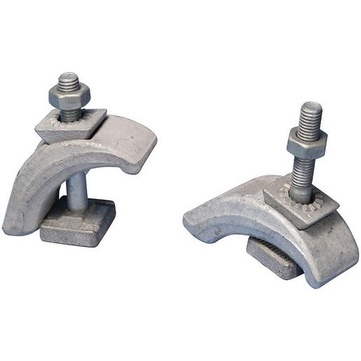 Trägerklammern zur Befestigung von Montageschienen an Deckenbalken, rückengelochte Seite der Montageschiene zum I-Träger hin. Trägerklammer für Schiene, Typ E5 oder Montageschiene, feuerverzinkter Stahl, 3?30 mm Flanschstärke.
