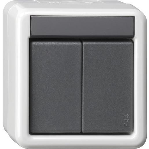 KNX Taster-Busankoppler WG AP 2fach mit 2-Punkt-Bedienung Grau Der Taster-Busankoppler ist die Schnittstelle zwischen dem KNX System und dem Anwender. Merkmale: Tastenfunktion: Schalten, Dimmen, Jalousie, Wertgeber 1 Byte und Szenennebenstelle. Funktion Schalten: Befehl beim Drücken und Loslassen der Tasten parametrierbar (EIN, AUS, UM, keine Reaktion). Funktion Dimmen: Befehl beim Drücken der Tasten parametrierbar (Heller-EIN, Dunkler-AUS, Heller- bzw. Dunkler-UM, Heller-UM, Dunkler-UM, keine Reaktion). Funktion Jalousie: Befehl beim Drücken der Tasten parametrierbar (AUF, AB, keine Reaktion). Funktion Wertgeber 1 Byte: Funktionsweise konfigurierbar. Funktion Szenennebenstelle: Funktionsweise konfigurierbar (mit oder ohne Speicherfunktion bei langem Tastendruck). Bei 2-Punkt-Bedienung (gerade stehende Wippe) kann die Wippe beidseitig (z. B. oben unten) bedient werden. Taster-Busankoppler im System Wassergeschützt Aufputz (IP44). Bedienkonzepte Wippen- oder Tastenfunktion einstellbar. Wippenfunktion: Schalten, Dimmen und Jalousie. Befehl bei Wippenbetätigung oben und unten parametrierbar (EIN, AUS, UM, keine Reaktion). Befehl bei Wippenbetätigung oben und unten parametrierbar (Heller-EIN, Dunkler-AUS, Heller Dunkler-UM, Heller-UM, Dunkler-UM, keine Reaktion). Befehl bei Wippenbetätigung parametrierbar (Wippe oben: AUF Wippe unten: AB, Wippe oben: AB Wippe unten: AUF).