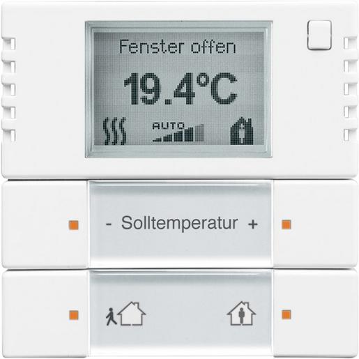 Raumtemperaturregler, studioweiß, Busch-Powernet KNX, Bedienelemente solo, Raumtemperaturregler Heiz-/Kühlbetrieb/Farbkonzept Mit Beschriftungsfeld. Für Busch-Installationsbus KNX Busankoppler 6120/12-101, 6120/13 und Busch-Powernet KNX Netzankopplung 6920/12, 6920/13. Unterstützung der KNX-Funktionen durch innovatives Farbkonzept (gelb=Beleuchtung, blau=Jalousie, orange=RTR, magenta=Szene und weiß=neutral/keine Funktionszuordnung) oder Standardbeleuchtung rot/grün. Bedienelement mit Raumtemperaturreglerfunktion zur Ansteuerung von 6164/10, 6164/11 in Verbindung mit KNX-Heizungsaktoren, handelsüblichen Stellantrieben oder analogen Stellantrieben (Stetigregler). Der Regler ist ein stetiger Raumtemperaturregler für Ventilator-Konvektoren (Fan Coil) in 2- und 4-Rohr Anlagen und konventionellen Heiz- oder Kühlanlagen Die Lüfterstufe kann manuell oder in den Automatikbetrieb geschaltet werden Transparenter Beschriftungsbogen mit Standardsymbolen in der Lieferung enthalten. Inkl. 10 Logikkanälen (Lichtszenenaktor, Sequenzaktor, Logikgatter etc.). Klasse des Temperaturreglers: 1 Beitrag zur Raumheizungsenergieeffizienz: 1,0%. Bedienelemente: Tastkontakte links/rechts zur Sollwert- und Betriebsartenwahl Anzeigeelemente: Betriebsartenanzeige über LCD Schutzart Gerät: IP 20 Temperaturbereich Gerät: -5 °C bis 45 °C Maße (H x B x T): 63 mm x 63 mm