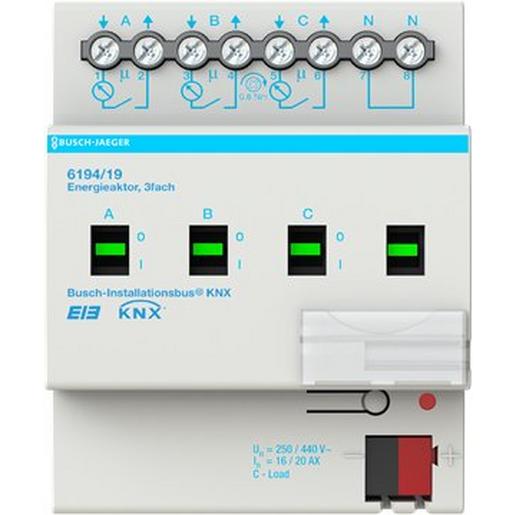 Systemtechnik, Busch-Installationsbus® KNX, REG-Aktoren, 3-fach-Energieaktor, Energieaktor 16A 3-fach 3-fach Schaltaktor Addition der Gesamtleistung über mehrere Geräte möglich. Manuelle „Vor-Ort-Betätigung“ möglich. Schaltzustandsanzeige der Kontakte Der Busanschluss erfolgt über die beiliegende Busklemme. Bedienelemente: Manuelle Betätigungsmöglichkeit für EIN/AUS über Schiebeschalter Anzeigeelemente: Statusanzeige der Ausgänge über Position der Schiebeschalter Anschlüsse: KNX-Linie: Busanschlussklemme Nennspannung: 230 V~, +10 % / -15 % Nennfrequenz: 50 Hz/60 Hz Ausgänge: 3x Schließer, potenzialfrei Lastart: AC1 Nennstrom: 16 A, bei cos ? 0,8 Ausgangsspannung: 230 V~ Lastart: AC3 Nennstrom: 16 A, bei cos ? 0,45 Ausgangsspannung: 230 V~ Schutzart Gerät: IP 20 Temperaturbereich Gerät: -5 °C bis 45 °C Maße (H x B x T): 90 mm x 72 mm x 64 mm Einbautiefe: 68 mm Teilungseinheit: 4 TE