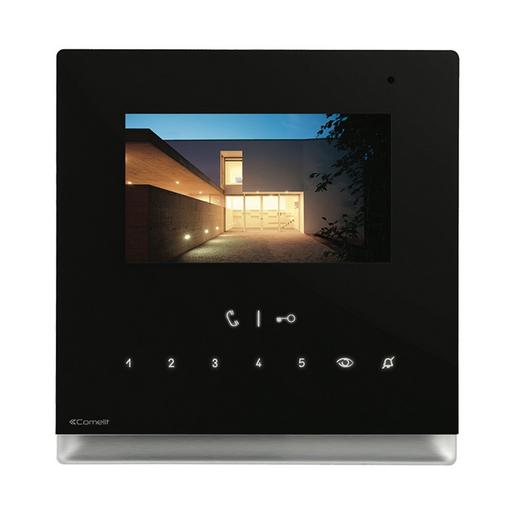 Innenstation Video Icona, schwarz, für Unterputz (mit Gehäuse Art. 6617) oder Aufputz (mit Halterung Art. 6620), 4,3″-Touchscreen 16/9 und Freisprechfunktion Fullduplex. Regelung der Helligkeit, der Farbe und der Lautstärke des Klingeltons, der individuell unter verschiedenen Melodien ausgewählt werden kann. Serienmäßige Ausstattung mit sensitive touch Tasten für Türöffnung, Sprechverbindung, Selbsteinschaltung, Ruftonabschaltung und 3 weitere programmierbare Funktionstasten, LED-Anzeigen für offene Tür und neue Nachrichten. Allgemeine Menüführung über Touchscreen. Verwaltet serienmäßig Etagenruf und Rufwiederholung, verfügt über Panik- und Alarm-Eingang und einen Steckplatz für eine Mikro-SD-Karte. Klingelton und Funktion Videospeicher mit Nachricht bei Abwesenheit können personalisiert werden. Auch in Standard-Anlagen PoE einsetzbar. Abmessungen: 142,5x147x23mm.