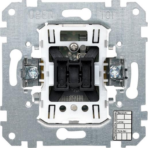 Busankopplungseinsatz, 1fach, ohne Mittelstellung Unterputzmontage. Einbau in CE60-Dosen Kompatibel mit System M und System Design Ästhetikwippen Beleuchtung, Jalousien und Szenen. Anzeige-LED immer EIN, immer AUS Die LED dient als Beleuchtung oder als Statusanzeige. Sie kann über Parameter eingestellt werden Stromversorgung über KNX Bus. Verbrauch 10 mA Schutzart: IP20 KNX Anschluss.