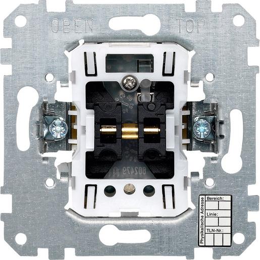 Die Wippe für Serienschalter. Wippe für Rollladenschalter und -taster aus Systemm, System Design und System Fläche können auf den Busankoppler-Einsatz 2fach aufgesteckt werden. Als Sonderanfertigung können auch die Schalterprogramme AQUADESIGN und AQUACLASSIC für den Busankoppler-Einsatz 2fach angepasst werden. Mit integriertem Busankoppler. Bei der Ausführung mit Mittelstellung können die Wippen nach oben und nach unten betätigt werden (Dreistellungswippe). Bei der Ausführung ohne Mittelstellung werden nur bei Betätigungen der unteren Wippenhälfte Telegramme erzeugt (Zweistellungswippe). Für die Montage in eine 60er-Installationsdose. Mit Taster und LED für den Programmiervorgang. Softwarefunktionen KNX: Für Artikelnummer 671298: Schalten. Umschalten. Dimmen. 1 Jalousiegruppe. Für Artikelnummer 671299: Schalten. Umschalten. Dimmen. 2 Jalousiegruppen. Ausführung: ohne Mittelstellung.