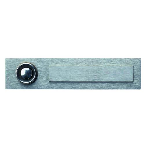 Albert-Klingelplatte 690940 aus Edelstahl, mit Edelstahl-Klingelknopf sowie Bolzenbefestigung. Mit zusätzlichem Namensschild zum gravieren und aufkleben. Ausmaße: 30 x 130 x 6 mm