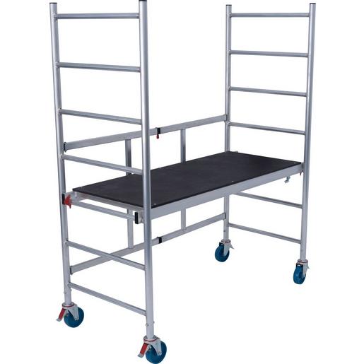 Das leicht verfahrbare und werkzeuglos aufstellbare Alu-FaltGerüst für den Innenausbau und Arbeiten im Außenbereich bei einer max. Arbeitshöhe bis zu 2,90 m. Leicht, kompakt mit gebremsten Fahrrollen (Ø 125 mm). Lieferung erfolgt in vormontierten Baugruppen. Nach Erstmontage ist das Gerüst schnell und ohne Werkzeug. auf- und abgebaut und besteht aus nur zwei Teilen: Gerüstrahmen und Belagbühne. Aus stabilem Aluminium-Rundrohr mit geschweißten, rutschsicheren Rundsprossen. Faltrahmen mit leicht bedienbarem Gelenk und Gelenksicherung. Auch zusammengeklappt ergonomisch über Fahrrollen transportierbar. Belagbühne mit leichtgängigem Schnellverschluss kann am zusammengeklappten Gerüst für den Transport und platzsparende Lagerung senkrecht eingehängt werden. Geringe Abmaße, Durchfahren von Türen möglich. TÜV-geprüft, Belastbarkeit 200 kg/m². Ideal für den Innenausbau und Arbeiten im Außenbereich bis zu einer Arbeitshöhe von 2,90 m.