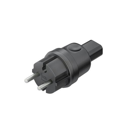 Stecker, ohne Schutzleiteranschluss, mit Zugentlastung und Kabelbiegeschutz, zum Anschluss an 2 adrige Illuminationsflachleitung H05RNH2-F (13,5 x 5,5 mm ± 0,5 mm), nach DIN EN 50525-2-82. Abmessung (ca. Maße) H : 100 Außen-Ø : 42 mm Nennspannung : 250 V Temperaturbereich : -40° – 70° C Schutzart : IP44 Werkstoff : NBR (Nitril-Butadien-Kautschuk) Werkstoff Steckereinsatz : Thermoplast Farbton : schwarz