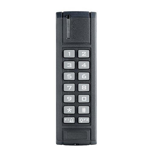 Bus-Bedienteil für außen, zur Zugangskontrolle des System 9000 über Codeeingabe, RFID-Karte oder -Chip. Zur Scharf-/Unscharfschaltung eines Bereichs oder zur Steuerung eines Schaltausgangs. Die Statusanzeige des Systems (scharf / unscharf) oder des Schaltausgangs ist per Software konfigurierbar. Belegt eine Adresse im System. Inkl. Sabotagesicherung. Schutzart: IP65. Vandalismus-Schutzart: IK08. Betriebsspannung über Bus. Stromverbrauch: 15mA (Ruhe), I-calc =15mA, RFID: 125kHz. Betriebstemperatur: -20°C bis +60°C. Abmessungen: 46 x 152 x 23mm. Länge des Anschlusskabels: 3m.