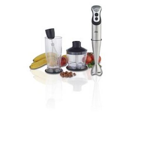 Stabmixer + Zerkleinerer, Püriert alles und noch viel mehr, Stufenlose Geschwindigkeitsregulierung, Turbo-Taste, Edelstahl-Design, Mit praktischem Schneebesen und Cutter-Set sowie Mixbecher, Praktisches Click-System zum Auswechseln des Zubehörs, Spezielle Pürierstabform verhindert Spritzer, Ergonomischer Griff