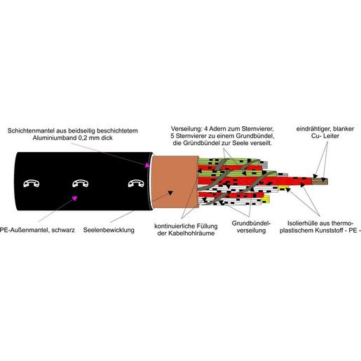 Massiver blanker Kupferleiter Durchmesser, je 4 Adern zu einem Sternvierer, die Vierer zu Bündeln und die Bündel zur Seele verseilt, Seelenbewicklung, Schichtenmantel, d.h. Schirm aus kunststoffbeschichtetem Aluminiumband, mit dem PE-Mantel festhaftend verbunden. Durch die Petrolat-Füllung der Hohlräume in der Kabelseele wird bei Beschädigung des Kabels das Eindringen von Wasser verhindert.