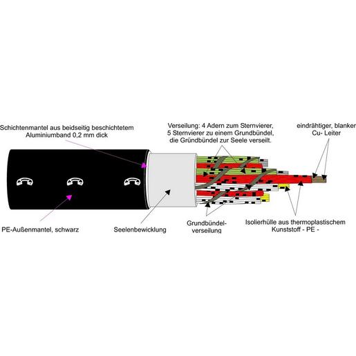 Massiver blanker Kupferleiter, PE-Isolierhülle, je 4 Adern zu einem Sternvierer, die Vierer zu Bündeln und die Bündel zur Seele verseilt, Seelenbewicklung, Schichtenmantel, d.h. Schirm aus kunststoffbeschichtetem Aluminiumband, mit dem PE-Mantel festhaftend verbunden