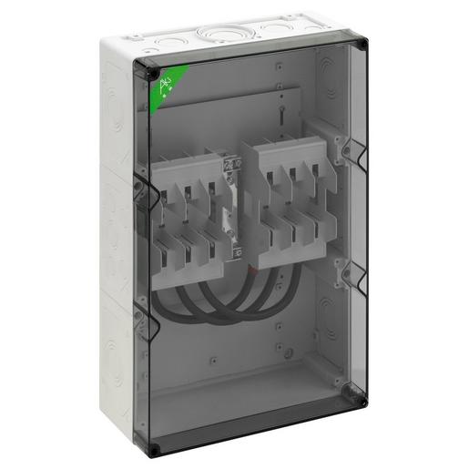 NH-Sicherungsgehäuse, Industrie Qualität, 2 x NH 00-Sicherungsunterteil, montiert auf Montageplatte, Bemessungsstrom 100 A, Schellenanschluss 1,5-70qmm, N-Klemme 2 x 50qmm, 2 Kabelverschraubungen M40, 1 Kabelverschraubung M50, mit Isolierstopfen, mit transparentem Deckel