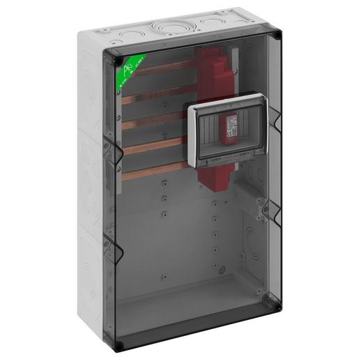 Überspannungsschutzgehäuse, Industrie Qualität, 5-polig, 40mm Sammelschienenabstand, mit CU-Schienen, L1…L3: 12 x 5mm, PE/N: 12 x 5mm, mit 10 Sammelschienenklemmen für CU-Leiter 4-35qmm, mit Klappfenster 6 TE, mit transparentem Deckel, plombierbar, mit Blitzstrom- und Überspannungs-Ableiter Typ 1+2 nach EN 61643-11 für Hauptstrom-Versorgungssysteme, Netzform TT/TNS, für den Einsatz bei Gebäuden ohne äußeren Blitzschutz, Blitzstrom: (10/350) 7,5/30kA, höchste Dauerspannung: 255 V AC, max. zul. Vorsicherung: 160A gG, anschlussfertig montiert auf Sammelschienensystem