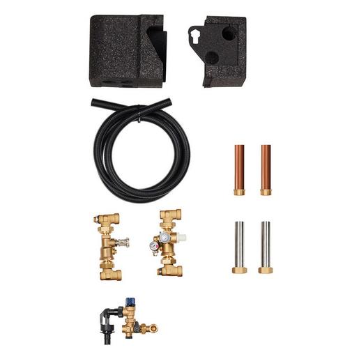 Anschluss-Set an bauseitige Verrohrung für uniTOWER Anschluss links, rechts oder von hinten, GEG konforme Wärmedämmschalen für den aktiven Kühlbetrieb geeignet. 10 bar Sicherheitsventil, 1 Zoll Wartungshähne, KFE-Hahn, Sicherheitsventil 3 bar, Wärmedämmschalen, Kleinteile, Ablaufschläuche, Manometer, Entlüftung.