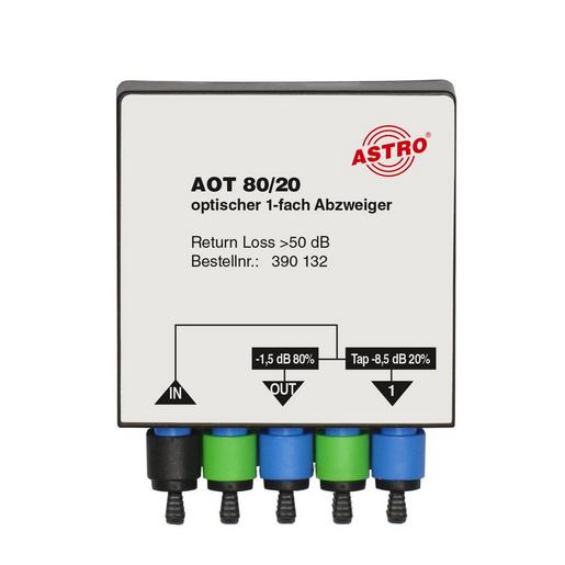 AOT 80/20 optischer 1-fach Abzweiger Optischer 1-fach Abzweiger, optische Wellenlänge 1260 – 1650 nm, 1,5 dB Durchgangsdämpfung, 8,5 dB Abzweigdämpfung, 3 mm MINI-Konnektoren,kompakte Bauform