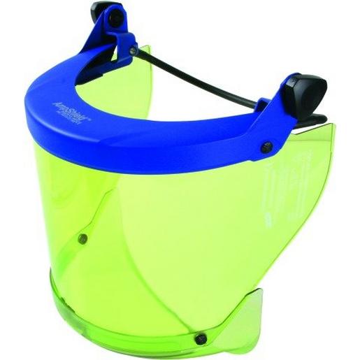 Störlichtbogengeprüfter Schutzschirm DEHNcare APS mit Spannband und Kinnschutz für Wartungs- und Instandhaltungsarbeiten an elektrischen Anlagen. Passend für alle gängigen Elektriker-Schutzhelme. Zertifiziert nach den Anforderungen der PSA-Verordnung (EU) 2016/425 zum Inverkehrbringen der persönlichen Schutzausrüstung. Hoher Tragekomfort. Hohe Schutzwirkung und geringer Verschleiß durch energieabsorbierende Nanopartikel. Beste Sicht durch Antibeschlag ? Beschichtung und hoher Lichtdurchlässigkeit. Störlichtbogengeprüft nach BG-Prüfgrundsatz GS-ET-29: Klasse 2 mit 423 kJ / m2