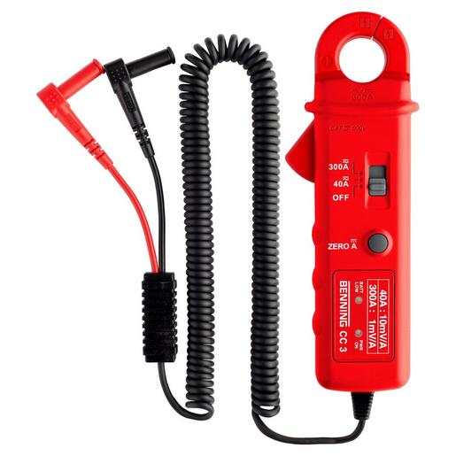 Benning CC 3 AC/DC-Stromzangenadapter. Zur Erweiterung des Strombereiches. Anzeige digital über Multimeter. Strommessbereich/DC 1 A – 300 A. Strommessbereich/AC 1 A – 300 A. Stromart Gleich-/Wechselstrom. Ausgang 1 mV/ 1 A. Erweitert den AC/DC-Strombereich von analogen und digitalen Multimetern bis 300 A. Messbereichswahl manuell. Zangenöffnung 25 mm. Ausführung als Adapter zum Anschließen an Multimeter. Messkreiskategorie Cat III. Max. Spannung Messkreiskategorie 600 V. Inklusive Tasche, 9 V Block LR61 Batterie, fest angeschlossene Messleitungen.