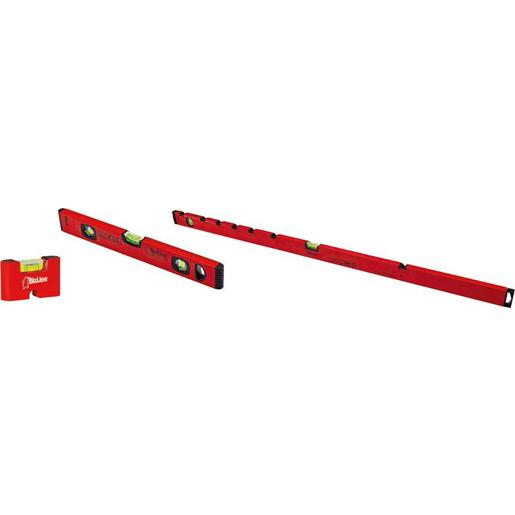 Dieses Set besteht aus einer Wasserwaage, 7 cm (BIZ 700 386), optimal für Steckdosen und Schalter, einer Aluminium-Wasserwaage, 40 cm (BIZ 700 044) und einer elektrischen Wasserwaage, 120 cm, optimal geeignet für Montagearbeiten (BIZ 700 383).