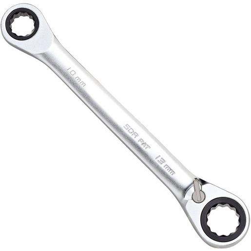 Umkehrbarer Ratschen-Ringschlüssel in 2 Größen 10/13 mm. 1 Schlüssel = 2 Größen! Maße (mm) 10/13. Integrierte Umkehrhebel.