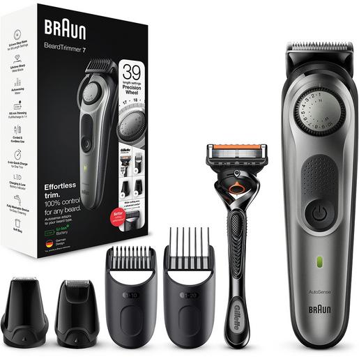 Erzielen Sie mühelos Ihren Style mit dem Braun BT7 Barttrimmer und Haarschneider für Herren. Dieser Barttrimmer ist schärfer, schneller und effizienter ? mit einer breiteren Trimmfläche, um mehr Haare bei jedem Zug zu erfassen und zu schneiden (ggü. vorherigen Braun Trimmern). Der Barttrimmer 7 verfügt über ein Präzisionsrad für 39 Längeneinstellungen, und ist mit lebenslang scharfen Klingen und Lithium-Ionen-Akku ausgestattet. Mit abwaschbarem Trimmerkopf und Kammaufsätzen. Im Lieferumfang enthalten: 1x Barttrimmer und Haarschneider 2x Präzisionskammaufsätze für Bart und Haare 1x Mini-Präzisionsscherkopf 1x Detail-Trimmerkopf 1x Gillette Fusion ProGlide Rasierer 1x Aufbewahrungstasche 1x Reinigungsbürste 1x Netzteil-Ladegerät 1x Benutzerhandbuch