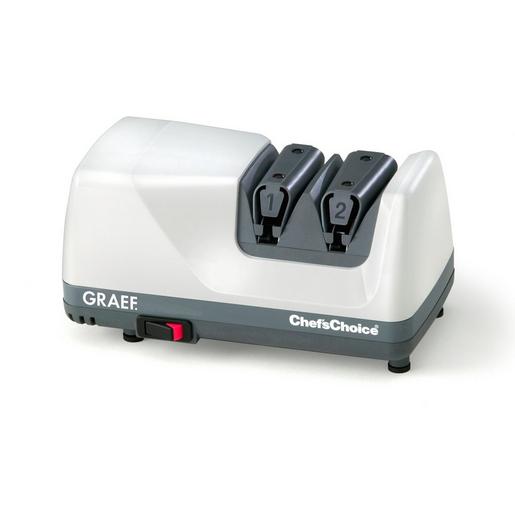 Messerschärfer CC 105, Kunststoffgehäuse, 2-Phasen-Schliff, 1. Phase: Schärfen mit Diamantscheiben, 2. Phase: Polieren/Abziehen mit Diamantscheiben, 20 Grad-Schleifwinkel für alle glatten und gezahnten Haushalts- u. Gewerbemesser, nicht für japanische Messer geeignet, langsamdrehende Schleifscheiben verhindern das Überhitzen der Klinge, genaue Messerpositionierung durch Elastomer-Winkelführungen, minimaler Materialabtrag, Ein-/Ausschalter, 2 Jahre Herstellergarantie, 230 Volt – 75 Watt