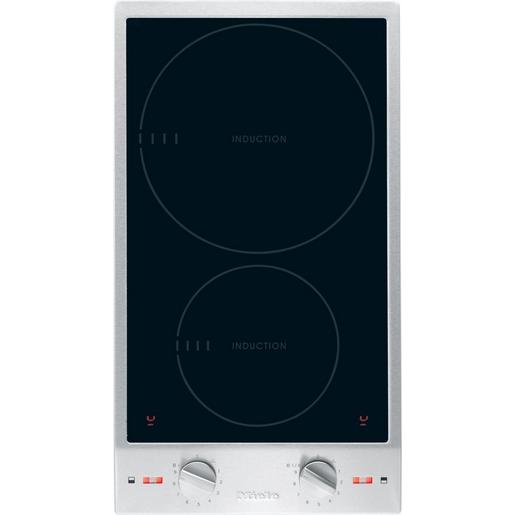 Umlaufender, massiver Edelstahl-Rahmen Kochzonenumrandung in Light-Print-Bedruckung Massive Metallknebel Geprägtes Miele Logo Steuerung über Metall-Schalterknebel auf einem abgesetzten Bedienpult 2 Kochzonen mit Ankoch-Automatik, TwinBooster und Warmhaltefunktion Induktions-Kochzonen Betriebskontrollleuchten und Restwärmeanzeigen Anzeige bei Aktivierung des Boosters mit Darstellung der gewählten Booster-Stufe Vorne 100-160 mm Ø, 1400 W, Booster 2200 W Hinten 160-230 mm Ø, 2300 W, Booster 3000 /3700 W 12 Leistungsstufen (Stufen 1-9 und Booster 1-2 sowie Warmhalten) Topf-/Topfgrößenerkennung Sicherheitsausschaltung Überhitzungsschutz integriertes Kühlgebläse Anschlusskabel mit Stecker Gesamtanschlusswert: 3,70 kW Wechselstrom: 230 V, 16 A Breite: 272 mm Tiefe: 500 mm Bei Einbau dieses Induktions-Kochfeldes über einem Backofen muss dieser mit einem Gebläse ausgestattet sein.