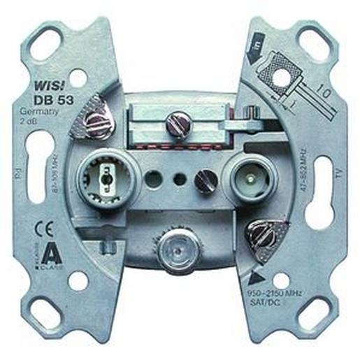 Antennensteckdose nach DIN 45 330,IEC und FTZ-Richtlinie, für Antennen-,BK- und Satellitenempfangs-Anlagen47-2400 MHz,für Einzelanlagen (3-Loch-Stichdose 1,5 dB),WISI DB 53,fernspeisbar über SAT-Ausgang.