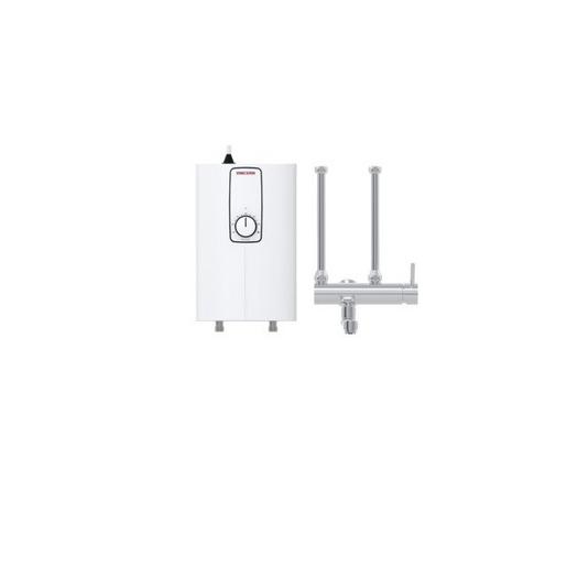 Warmwasser-Set mit dem elektronischen Kompakt-Durchlauferhitzer DCE 11/13 H zur Übertisch-Montage und einer Einhebel-Wandarmatur für die Küchenspüle oder das Ausgussbecken.