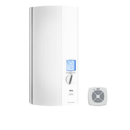 AEG vollelektronischer Durchlauferhitzer DDLE ÖKO TD 27, 27 kW, 400 V, weiß   Durchlauferhitzer, vollelektronisch geregelt, zur Versorgung von Waschtisch, Küchenspüle, Dusche, Badewanne. Gradgenaue Temperaturwahl durch 2-farbig hinterleuchtetes, gut lesbares Multifunktionsdisplay. Anzeige von Temperatur, Durchflussmenge, Energieverbrauch und Uhrzeit. Zwei Speichertasten für individuell einstellbare Temperaturen. Komfortfunktion: ECO-Taste, Wassermengenautomatik, Duschprogramm, ÖKO-Funktion für energiesparenden Betrieb. Temperaturfunktaster zur einmaligen Temperaturwahl für den nächsten Zapfvorgang. Heizblock aus glasfaserverstärktem Polyamid. 4 Heizwendeln direkt im Wasser liegend. Messturbine zur präzisen Durchflussmengenerfassung. Elektronische Luftblasenerkennung. Prozessgesteuertes Motorventil für gradgenaue Wassertemperatur bei maximaler Durchflussmenge. Temperaturwahl von 30 °C bis 60 °C. Integriertes Diagnosesystem. Für Zulauftemperaturen bis maximal 60°C (z. B. solar vorgewärmtes Wasser) geeignet. Anschlussmöglichkeiten für Fern- und Direktzapfung. Zum Anschluss an Kunststoffrohrinstallationen mit DVGW-Prüfzeichen. Einfache Montage durch separates Montageblech und Schnellspanner, mit Montageschablone, Haubendemontage von vorne, ohne Schrauben, Elektroanschluss von oben oder unten. Stromversorgung mit Festanschluss. Übertischmontage, Untertischmontage mit Sonderzubehör UT 104 möglich. Anschluss an alle handelsüblichen geschlossenen Armaturen. Qualitäts- und Sicherheitszeichen: CE-Zeichen, VDE-/ GS-Zeichen, Funkschutzzeichen / EMV.   Anschlussspannung : 3/PE ~ 400 V 50 Hz Anschlussleistung : 27 kW Absicherung : 3 x 40 A Temperaturwahl : 30°C – 60°C Schutzart : IP 25 Warmwasserleistung : 14,9 l/min (bei Nennleistung und 26 K Temperaturerhöhung) Einschaltmenge : 2,5 l/min Spezif. Widerstand (Wasser) : >900 ? cm Abmessungen H/B/T : 485/226/93 mm Gewicht mit Wasserfüllung : 4,2 kg
