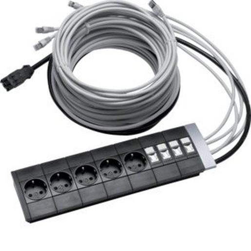 Modul vorbestückt mit 4xCat.6/5xSteckdose Leitung 6,5m zu Designsäule DEF/DES. Geräteeinbaumodul zum Anbau für Deckenanschlusssäulen bestehend aus 5 Schuko-Steckdosen, 4 Datenmodule Cat.6 STP inklusive Anschlussleitungen. Konfektionierte Leitungen (Länge 6,5 m) 3 x 2,5 mm² (WAGO/WINSTA-Stecktechnik) und 4 Datenleitungen mit RJ45-Stecker.