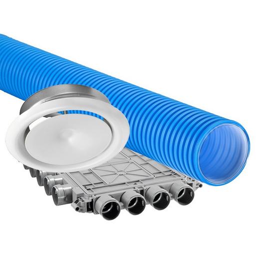 Flexrohr-Paket mit Komponenten für die zentrale Zuluft- und Abluftführung zur Installation in der Dämmschicht unter dem Estrich (innerhalb der wärmegedämmten Gebäudehülle auch in Steigschächte, Hohlwände und Doppeldecken). Das Paket beinhaltet Luftverteiler, Zu- und Abluftventile, das flexible Lüftungsrohr mit Zubehör sowie ein Montageset. Projektbezogenes Paket, dessen Inhalt durch eine Lüftungsplanung definiert wird. Das komplette notwendige Material für die Installation des Luftverteilsystems ist enthalten. Wohneinheiten bis 60 m²