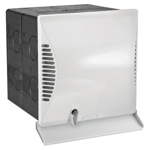 Quadratische Wandhülse aus EPP, 320 x 320 mm (Durchbruch in Außenwand 325 x 325 mm), Länge 480 mm, bauseits anzupassen an Wandstärke 320 – 480 mm, inkl. Zubehör zur Anpassung des Lüftungsgerätes an die Wandstärke und UV-beständige Außenwandblende aus Kunststoff mit integrierter Kondensatableitung (340 x 340 x 55 mm). Wandhülse (Brandklasse B2) und Außenwandblende (Brandklasse B1) sind für die Installation des Lüftungsgerätes funktionsnotwendig.