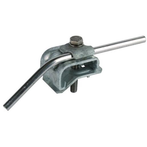 Dachrinnenklemme nach DIN EN 62561-1, zum Verbinden von Rundleitern dem Wulst der Dachrinne. Ausführung in Einschraubentechnik mit Klemmbock, Leitungsführung längs.