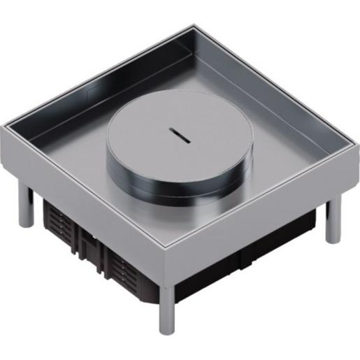 Nivellierbare Schwerlastkassette Q06 mit Tubus für 6x45er Module Belastiefe 25mm. Nivellierbare Kassette mit Tubus bis 20 kN, quardratisch, bestehend aus Kassettenrahmen, Tubus-Kassettendeckel, Dichtung. Einsetzbar für alle Bodenaufbauarten in trockenen Räumen im Innenbereich mit trocken oder nass gepflegten Böden. Die Dichtung ist austauschbar um die Schutzart dauerhaft gewährleisten zu können. Der Tubus bietet einen 10 mm Schwallwasserschutz im genutzten Zustand, ist als Wendetubus ausgeführt und somit unverlierbar. Für den Einbau von stufenweise absenkbaren Gerätebechern, für bis zu 6 Geräte 45 x 45 mm. Geprüft nach DIN EN 50085-1 und DIN EN 50085-2-2.